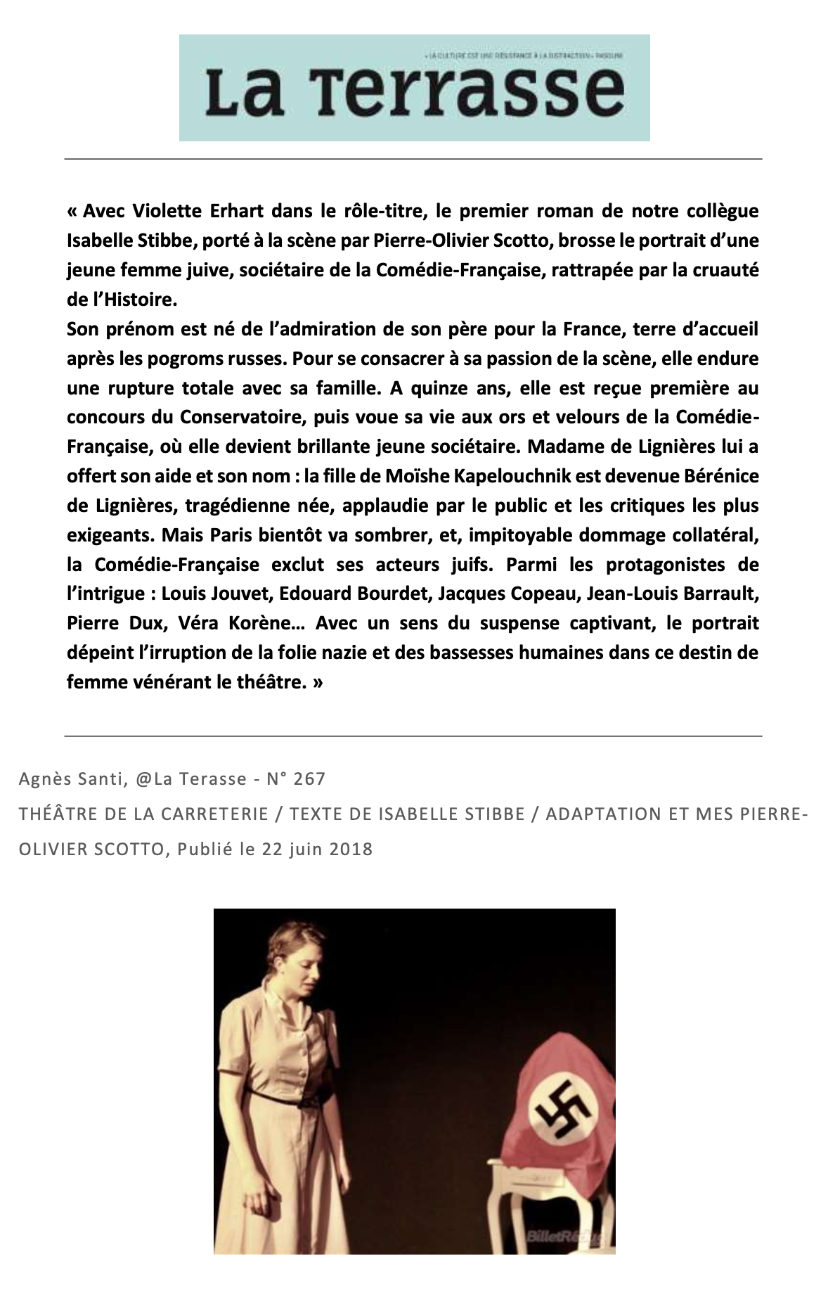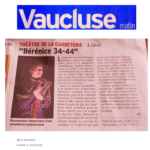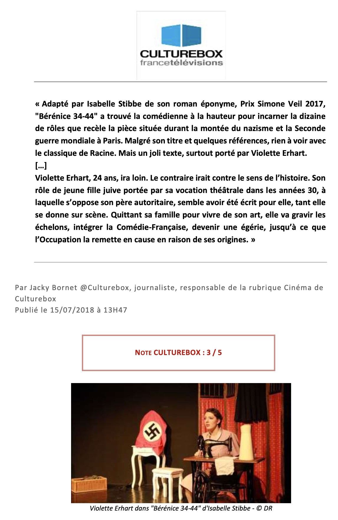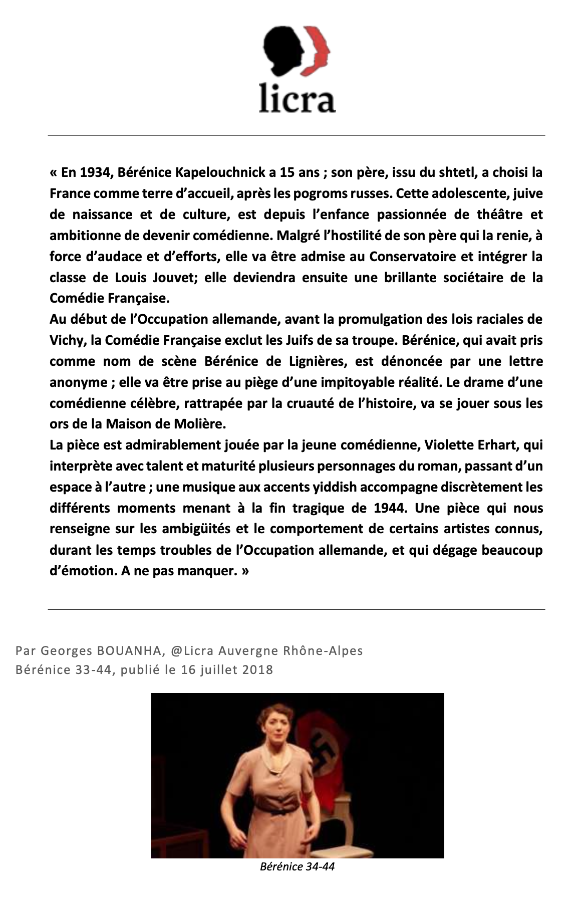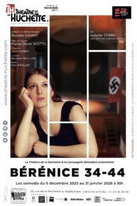 BÉRÉNICE 34-44  est un seul en scène adapté du roman de Isabelle Stibbe qui suit la vie d’une jeune comédienne juive durant les heures sombres de l’Occupation à la Comédie Française, quand la tragédie historique dépasse la tragédie théâtrale. Une pièce historique poignante  et un immense cri d’amour au théâtre et à ses acteurs.