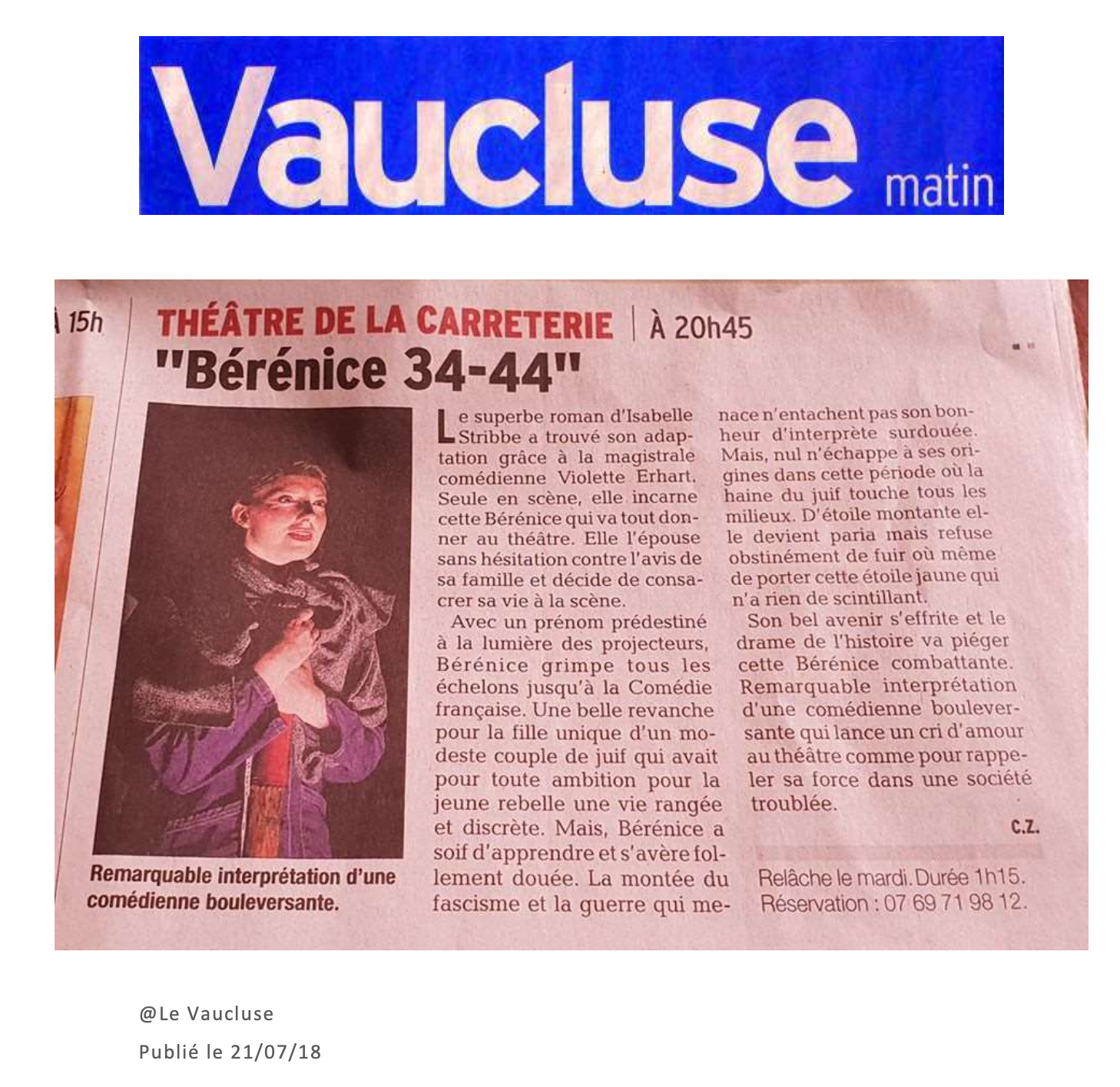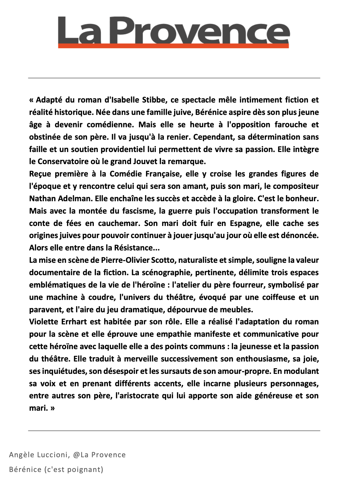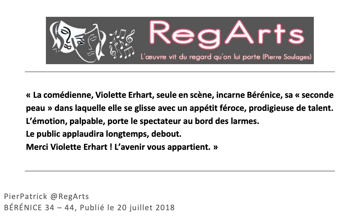 BÉRÉNICE 34-44  est un seul en scène adapté du roman de Isabelle Stibbe qui suit la vie d’une jeune comédienne juive durant les heures sombres de l’Occupation à la Comédie Française, quand la tragédie historique dépasse la tragédie théâtrale. Une pièce historique poignante  et un immense cri d’amour au théâtre et à ses acteurs.