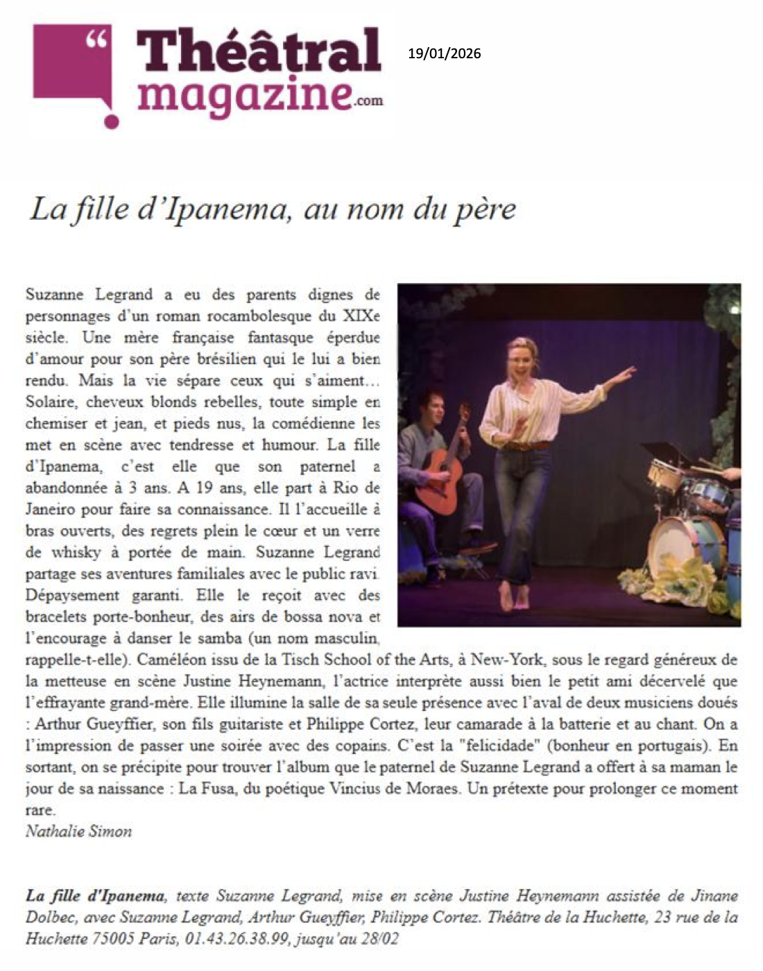 A 19 ans, Suzanne part au Brésil rencontrer son père pour la première fois. De lui, elle ne connaît que l’album de Bossa Nova qu’il avait offert à sa mère avant sa naissance. Un voyage initiatique sur des airs de Samba qui lui permettra de recoller les pièces d’un puzzle familial haut en couleurs, entre rire, larmes et saudade… Tudo bem !