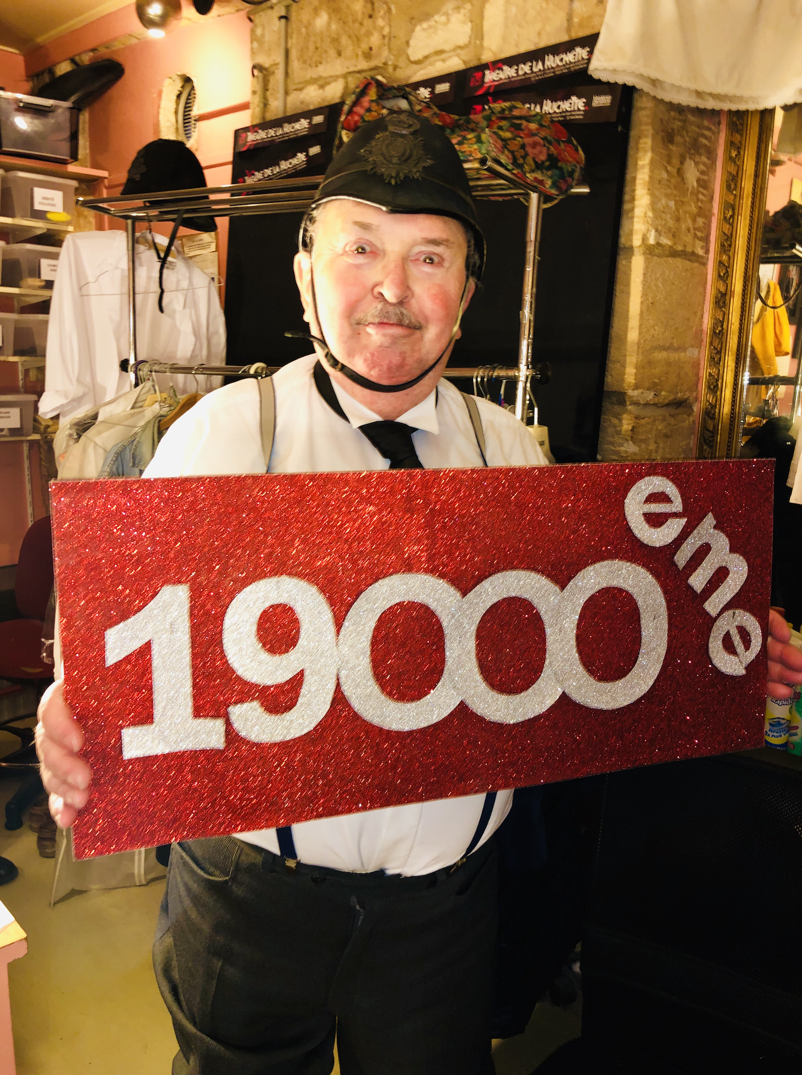 Le 23 mars 2019, huit de nos sociétaires donnaient la 19.000ème représentation de La Cantatrice chauve et de La Leçon au Théâtre de la Huchette, préservant le record du monde du nombre de levers de rideau d’un spectacle dans un même théâtre. Si leur “score“ individuel s’avérait plus modeste, l’un d’entre eux, Roger Défossez, affichait tout de même, depuis quelques temps déjà, plus de 6000 soirées dans le rôle de Monsieur Smith. Dans l’album souvenir ci-dessous, vous reconnaitrez Hélène Cohen (Mme Martin), Valérie Choquard (Mme Smith), Joséphine Fresson (La bonne), Stéphanie Chodat (L’élève), Roger Défossez (Mr Smith), Didier Bailly (Mr Martin), Jean-Michel Bonnarme (Le professeur), mais aussi notre régisseur Yves Thuillier et notre caissière d’alors Michelle Josset.